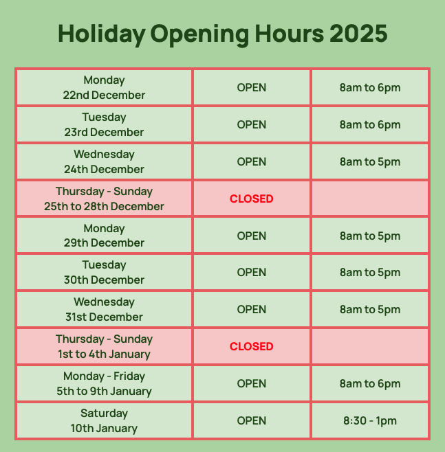 Click here to view our Christmas and New Year opening hours.